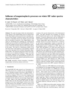 André, R.; Pinnock, Michael; Villain, J.-P.; Hanuise, C.. 2002 Influence of magnetospheric processes on winter HF radar spectra characteristics. Annales Geophysicae, 20 (11). 1783-1793. 10.5194/angeo-20-1783-2002