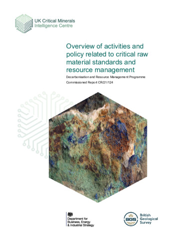 Bide, T.; Horn, S.; Gunn, A.G.. 2022 Overview of activities and policy related to critical raw material standards and resource management. Nottingham, UK, British Geological Survey, 79pp. (CR/21/124N) (Unpublished)