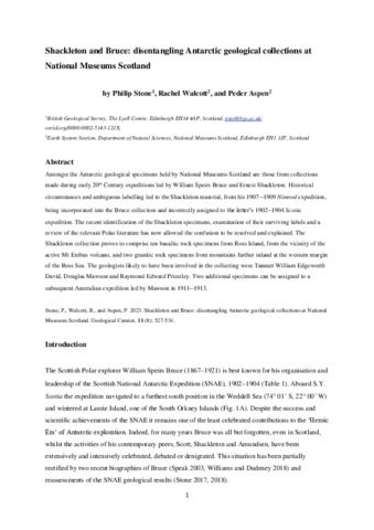 Amongst the Antarctic geological specimens held by National Museums Scotland are those from collections made during early 20th Century expeditions led by William Speirs Bruce and Ernest Shackleton. Historical circumstances and ambiguous labelling led to the Shackleton material, from his 1907–1909 Nimrod expedition, being incorporated into the Bruce collection and incorrectly assigned to the latter’s 1902–1904 Scotia expedition. The recent identification of the Shackleton specimens, examination of their surviving labels and a review of the relevant Polar literature has now allowed the confusion to be resolved and explained. The Shackleton collection proves to comprise ten basaltic rock specimens from Ross Island, from the vicinity of the active Mt Erebus volcano, and two granitic rock specimens from mountains further inland at the western margin of the Ross Sea. The geologists likely to have been involved in the collecting were Tannatt William Edgeworth David, Douglas Mawson and Raymond Edward Priestley. Two additional specimens can be assigned to a subsequent Australian expedition led by Mawson in 1911–1913.
