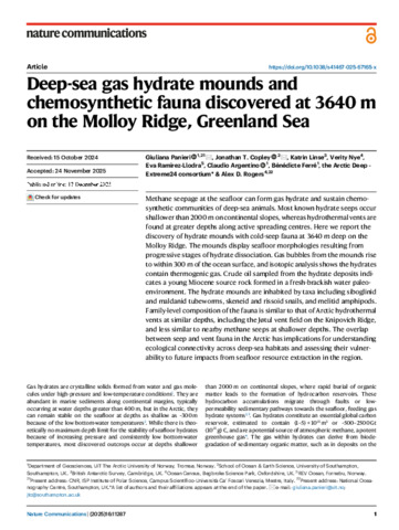Deep-sea gas hydrate mounds and chemosynthetic fauna discovered at 3640 m on the Molloy Ridge, Greenland Sea.