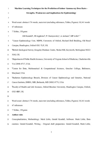 Kendall, G.M.; Appleton, J.D.; Chernyavskiy, P.; Arsham, A.; Little, M.P.. 2025 Machine learning techniques for the prediction of indoor gamma-ray dose rates – Strengths, weaknesses and implications for epidemiology. Journal of Environmental Radioactivity, 282, 107595. 10.1016/j.jenvrad.2024.107595