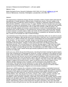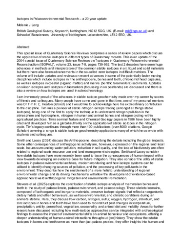 This special issue of Quaternary Science Reviews comprises a series of review papers which discuss the application of stable isotopes to different types of Quaternary records. This is an update of the 2004 special issue of Quaternary Science Reviews on “Isotopes in Quaternary Paleoenvironmental Reconstruction (ISOPAL)”, volume 23, issue 7–8, pages 739–992. The last 2 decades have seen huge advances in methods and interpretation of the common stable isotopes in air, liquid and solid materials but there have also been advancements in the so-called rarer isotopes in difficult matrices. The volume will include updates and reviews on recent advances in some of the potentially faster moving disciplines which include isotopes in: the anthropocene, bones and teeth, chironomid head capsules, as well as isotopes in coastal (organic matter) and marine (benthic foraminifera) sediments. Updates on silicon isotopes and isotopes in biomarkers (focussing in on peatlands) are discussed and there is also a review on how isotopes are used in sclerochronology.