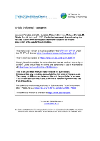 Predictive framework for estimating the risks to raptors from ecologically relevant exposure to second generation anticoagulant rodenticides.