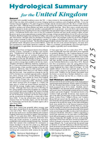 The monthly summary of hydrological conditions in the United Kingdom is compiled as part of the National Hydrological Monitoring Programme (a joint UKCEH and BGS enterprise). The report features contemporary data for rainfall, river flow, reservoir and groundwater levels in the form of maps and graphs. A commentary is provided on the status of the nation’s water resources and any notable hydrological events during the month. The National River Flow and National Groundwater Level Archives help provide an historical context for these contemporary assessments. Financial support for the production of the Hydrological Summaries is provided by Defra, the Environment Agency, the Scottish Environment Protection Agency, the Rivers Agency in Northern Ireland and the Office of Water Services.