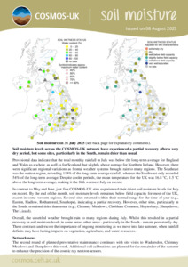 The COSMOS-UK soil moisture status report provides an insight into the current soil moisture conditions across the UK as monitored by the COSMOS-UK network. The network comprises approximately 50 sites at which a cosmic ray neutron sensor is deployed to monitor soil moisture within a footprint of about 12 hectares. The report is comprised of: maps of end of month soil moisture both as volumetric water content and as a soil moisture index; a short description of current status; and selected time series graphs showing data from the last three years.