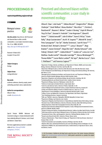 © 2025 The Author(s). Published by the Royal Society under the terms of the Creative Commons Attribution License http://creativecommons.org/licenses/by/4.0/, which permits unrestricted use, provided the original author and source are credited. shaw-et-al-2025-perceived-and-observed-biases-within-scientific-communities-a-case-study-in-movement-ecology.pdf - Published Version Available under License Creative Commons Attribution 4.0. Download (3MB) | Preview |