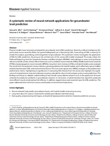 Physical models have long been employed for groundwater level (GWL) prediction. Recently, artificial intelligence (AI), particularly neural networks (NNs), has gained widespread use in forecasting GWL. Forecasting of GWL is essential to enable the analysis, quantifying, and management of groundwater. This systematic review investigates the application of NNs for GWL prediction, focusing on the architectures of the various NN models employed. The study utilizes the Preferred Reporting Items for Systematic Reviews and Meta-Analysis (PRISMA) methodology to screen and synthesize relevant scientific articles. Various NN architectures, such as artificial neural networks (ANNs), feedforward neural networks (FFNNs), backpropagation neural networks (BPNNs), long short-term memory (LSTM), and hybrid models, were analyzed. The results from the systematic review indicate a growing preference for hybrid models, which effectively capture hidden relationships between GWL and environmental factors. The root mean square error (RMSE) emerges as the predominant performance metric, highlighting its significance in evaluating NNs. Results from the review also highlight the significance of comprehensive, long-term datasets covering a decade for robust trend analyses and accurate predictions. The findings contribute to a deeper understanding of new trends in groundwater research such as the application of neural networks for prediction problems in groundwater research. In conclusion, a hybrid metaheuristic algorithm produced more efficient results emphasizing their efficacy. In addition, lagged values were essential input for GWL prediction. The paper addressed both technical nuances and broader environmental implications.