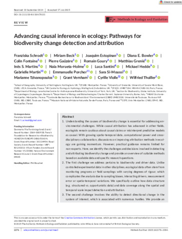 •1. Understanding the causes of biodiversity change is essential for addressing environmental challenges. While causal attribution has advanced in other fields, ecologists remain cautious about causal claims or misinterpret predictive models as causal. With growing spatio‐temporal data, computational power and cross‐disciplinary collaboration, discussions on improving attribution methods in ecology are gaining momentum. However, practical guidance remains limited for non‐experts. Here, we identify the challenges and decisions involved in detecting and attributing biodiversity change and provide an overview of suitable methods based on available data and specific research questions. •2. The first challenge we address pertains to biodiversity and driver data. Unlike controlled experimental data in other disciplines, ecological data often stem from monitoring programs or field samplings with varying degrees of rigour, which complicates the analysis due to sampling biases, interacting drivers, measurement error or spatio‐temporal variations. We specifically outline how data structure (e.g. structured vs. opportunistic data) and data coverage along the spatial and temporal scale impact detection and attribution. •3. The second challenge involves the ability to detect directional change in the system of interest, which is associated with numerous hurdles. We provide an overview of the most relevant approaches to deal with sampling variability, gaps and biases in the data, non‐linearity in the temporal trends and to identify the most appropriate spatio‐temporal resolution. •4. For the third challenge, causal attribution, we focus on data‐driven approaches. We review recent frameworks that draw on methodologies from other disciplines, offering analytical roadmaps and step‐by‐step guidance for causal inference. These include constructing theoretical causal models a priori, full causal models based on data and theory and posterior causal interpretation tailored to specific data and research questions. •5. Moving forward, it is essential to foster interdisciplinary collaboration to adapt and refine methodologies from other fields, ensure robust data collection and sharing practices, promote the integration of advanced computational tools and improve the link between data‐driven and theory‐driven approaches. This approach will enhance our ability to make robust causal inferences; thereby improving our understanding of biodiversity changes and informing effective conservation strategies.