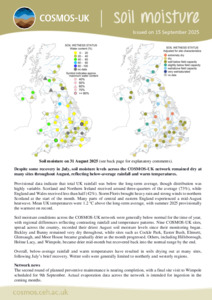 The COSMOS-UK soil moisture status report provides an insight into the current soil moisture conditions across the UK as monitored by the COSMOS-UK network. The network comprises approximately 50 sites at which a cosmic ray neutron sensor is deployed to monitor soil moisture within a footprint of about 12 hectares. The report is comprised of: maps of end of month soil moisture both as volumetric water content and as a soil moisture index; a short description of current status; and selected time series graphs showing data from the last three years.