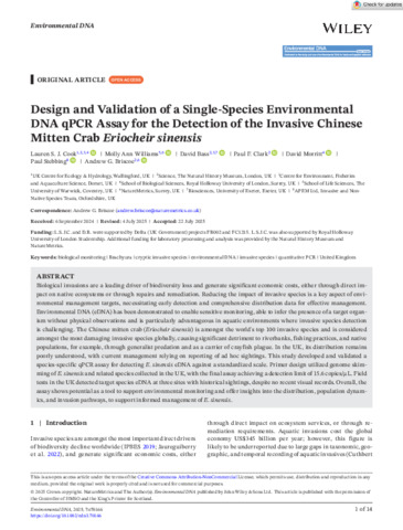 Design and validation of a single-species environmental DNA qPCR assay for the detection of the invasive Chinese mitten crab Eriocheir sinensis.