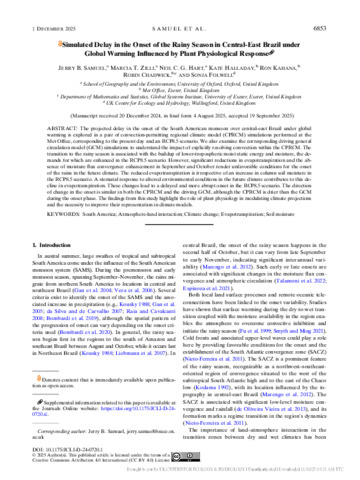 Samuel, Jerry B.; Zilli, Marcia T.; Hart, Neil C.G.; Halladay, Kate; Kahana, Ron; Chadwick, Robin; Folwell, Sonja. 2025 Simulated delay in the onset of the rainy season in central-east Brazil under global warming influenced by plant physiological response. Journal of Climate, 38 (23). 6853 -6872. 10.1175/JCLI-D-24-0720.1