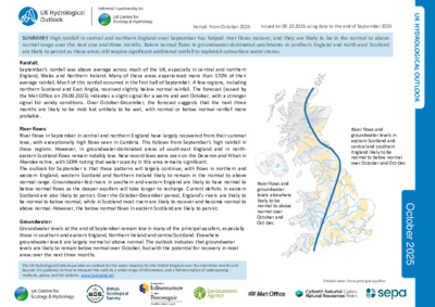 Rhodes- Smith, Mark; Suman, Gayatri. 2025 UK hydrological outlook - October 2025. Wallingford, UK, UK Centre for Ecology & Hydrology, 2pp. (UKCEH Project no. 09081)