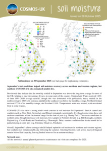 The COSMOS-UK soil moisture status report provides an insight into the current soil moisture conditions across the UK as monitored by the COSMOS-UK network. The network comprises approximately 50 sites at which a cosmic ray neutron sensor is deployed to monitor soil moisture within a footprint of about 12 hectares. The report is comprised of: maps of end of month soil moisture both as volumetric water content and as a soil moisture index; a short description of current status; and selected time series graphs showing data from the last three years.