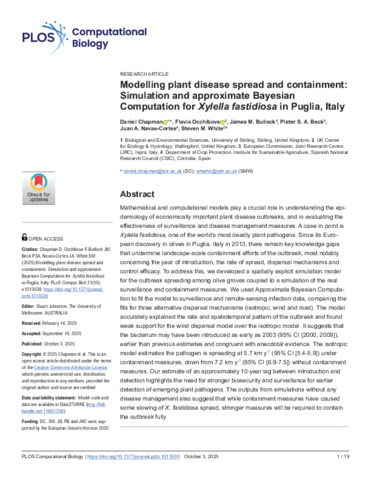 Modelling plant disease spread and containment: simulation and approximate Bayesian computation for Xylella fastidiosa in Puglia, Italy.