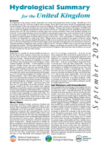 The monthly summary of hydrological conditions in the United Kingdom is compiled as part of the National Hydrological Monitoring Programme (a joint UKCEH and BGS enterprise). The report features contemporary data for rainfall, river flow, reservoir and groundwater levels in the form of maps and graphs. A commentary is provided on the status of the nation’s water resources and any notable hydrological events during the month. The National River Flow and National Groundwater Level Archives help provide an historical context for these contemporary assessments. Financial support for the production of the Hydrological Summaries is provided by Defra, the Environment Agency, the Scottish Environment Protection Agency, the Rivers Agency in Northern Ireland and the Office of Water Services.