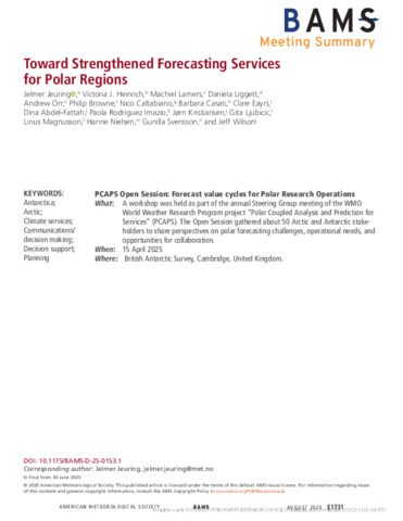 PCAPS Open Session: Forecast value cycles for Polar Research Operations: A workshop was held as part of the annual Steering Group meeting of the WMO World Weather Research Program project “Polar Coupled Analysis and Prediction for Services” (PCAPS). The Open Session gathered about 50 Arctic and Antarctic stakeholders to share perspectives on polar forecasting challenges, operational needs, and opportunities for collaboration.