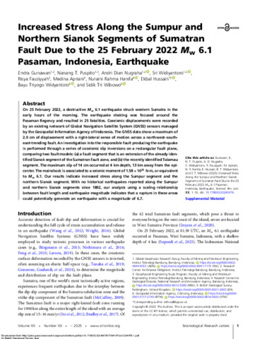 On 25 February 2022, a destructive Mw 6.1 earthquake struck western Sumatra in the early hours of the morning. The earthquake shaking was focused around the Pasaman Regency and resulted in 25 fatalities. Coseismic displacements were recorded by an existing network of Global Navigation Satellite System (GNSS) sensors managed by the Geospatial Information Agency of Indonesia. The GNSS data show a maximum of 2.0 cm of displacement with a right-lateral sense of motion across a northwest–southeast-trending fault. An investigation into the responsible fault producing the earthquake is performed through a series of coseismic slip inversions on a rectangular fault plane, comparing two fault models: (a) a fault segment that is an extension of the already identified Sianok segment of the Sumatran fault zone, and (b) the recently identified Talamau segment. The maximum slip of 14 cm occurred at 4 km depth, 13 km away from the epicenter. The mainshock is associated to a seismic moment of 1.58×1025 N·m, or equivalent to Mw 6.1. Our results indicate increased stress along the Sumpur segment and the northern Sianok segment. With no historical earthquakes reported along the Sumpur and northern Sianok segments since 1892, our analysis using a scaling relationship between fault length and earthquake magnitude indicates that a rupture in these areas could potentially generate an earthquake with a magnitude of 6.7.
