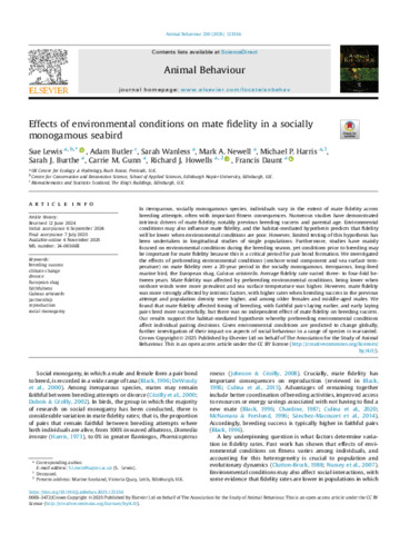 In iteroparous, socially monogamous species, individuals vary in the extent of mate fidelity across breeding attempts, often with important fitness consequences. Numerous studies have demonstrated intrinsic drivers of mate fidelity, notably previous breeding success and parental age. Environmental conditions may also influence mate fidelity, and the habitat-mediated hypothesis predicts that fidelity will be lower when environmental conditions are poor. However, limited testing of this hypothesis has been undertaken in longitudinal studies of single populations. Furthermore, studies have mainly focused on environmental conditions during the breeding season, yet conditions prior to breeding may be important for mate fidelity because this is a critical period for pair bond formation. We investigated the effects of prebreeding environmental conditions (onshore wind component and sea surface temperature) on mate fidelity over a 20-year period in the socially monogamous, iteroparous, long-lived marine bird, the European shag, Gulosus aristotelis. Average fidelity rate varied three- to four-fold between years. Mate fidelity was affected by prebreeding environmental conditions, being lower when onshore winds were more prevalent and sea surface temperature was higher. However, mate fidelity was more strongly affected by intrinsic factors, with higher rates when breeding success in the previous attempt and population density were higher, and among older females and middle-aged males. We found that mate fidelity affected timing of breeding, with faithful pairs laying earlier, and early laying pairs bred more successfully, but there was no independent effect of mate fidelity on breeding success. Our results support the habitat-mediated hypothesis whereby prebreeding environmental conditions affect individual pairing decisions. Given environmental conditions are predicted to change globally, further investigation of their impact on aspects of social behaviour in a range of species is warranted.