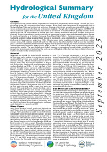 The monthly summary of hydrological conditions in the United Kingdom is compiled as part of the National Hydrological Monitoring Programme (a joint UKCEH and BGS enterprise). The report features contemporary data for rainfall, river flow, reservoir and groundwater levels in the form of maps and graphs. A commentary is provided on the status of the nation’s water resources and any notable hydrological events during the month. The National River Flow and National Groundwater Level Archives help provide an historical context for these contemporary assessments. Financial support for the production of the Hydrological Summaries is provided by Defra, the Environment Agency, the Scottish Environment Protection Agency, the Rivers Agency in Northern Ireland and the Office of Water Services.