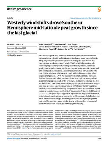 Westerly wind shifts drove Southern Hemisphere mid-latitude peat growth since the last glacial.
