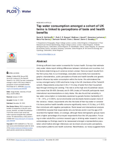 Tap water consumption amongst a cohort of UK twins is linked to perceptions of taste and health benefits.