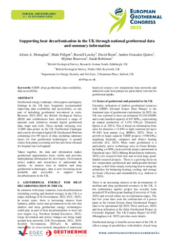 Monaghan, Alison A.; Fellgett, Mark; Lawley, Russell; Boon, David; Gonzalez Quiros, Andres; Receveur, Mylene; Robinson, Sarah. 2025 Supporting heat decarbonisation in the UK through national geothermal data and summary information. In: Shaping the Future : European Geothermal Congress 2025, Zurich, Switzerland, 6-10 Oct 2025. European Geothermal Congress.