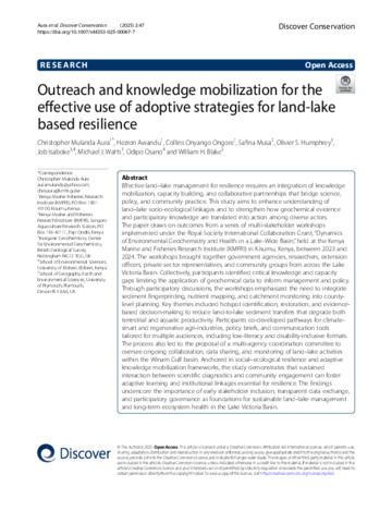 Aura, Christopher Mulanda; Awandu, Hezron; Ongore, Collins Onyango; Musa, Safina; Humphrey, Olivier S.; Isaboke, Job; Watts, Michael J.; Osano, Odipo; Blake, William H.. 2025 Outreach and knowledge mobilization for the effective use of adoptive strategies for land-lake based resilience. Discover Conservation, 2 (1). 10.1007/s44353-025-00067-7