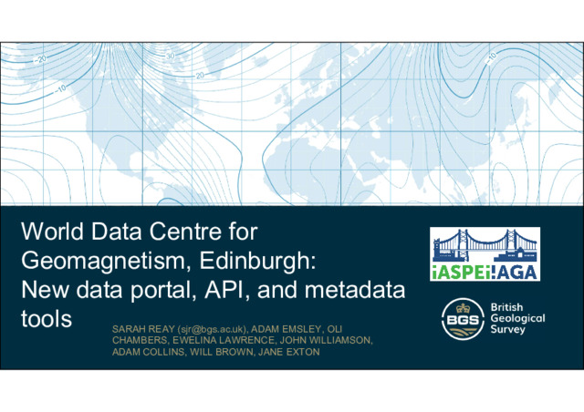 Reay, Sarah; Emsley, Adam; Chambers, Oli; Lawrence, Ewelina; Williamson, John; Collins, Adam; Brown, Will; Exton, Jane. 2025 World Data Centre for Geomagnetism, Edinburgh: New data portal, API, and metadata tools. [Speech] In: IAGA-IASPEI Joint Scientific Meeting 2025, Lisbon, Portugal, 31 Aug - 5 Sep 2025. (Unpublished)