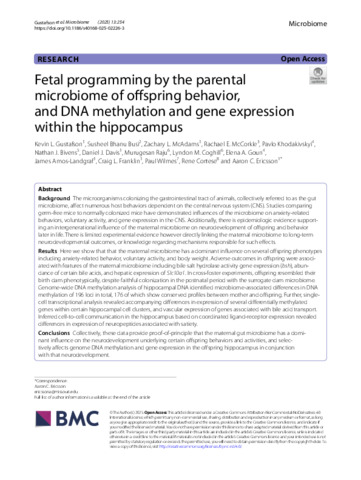 Fetal programming by the parental microbiome of offspring behavior, and DNA methylation and gene expression within the hippocampus.