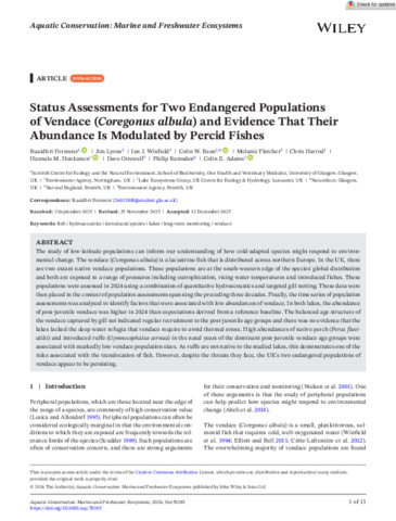 The study of low‐latitude populations can inform our understanding of how cold‐adapted species might respond to environmental change. The vendace (Coregonus albula) is a lacustrine fish that is distributed across northern Europe. In the UK, there are two extant native vendace populations. These populations are at the south‐western edge of the species' global distribution and both are exposed to a range of pressures including eutrophication, rising water temperatures and introduced fishes. These populations were assessed in 2024 using a combination of quantitative hydroacoustics and targeted gill netting. These data were then placed in the context of population assessments spanning the preceding three decades. Finally, the time series of population assessments was analysed to identify factors that were associated with low abundances of vendace. In both lakes, the abundance of post‐juvenile vendace was higher in 2024 than expectations derived from a reference baseline. The balanced age structure of the vendace captured by gill net indicated regular recruitment to the post‐juvenile age groups and there was no evidence that the lakes lacked the deep water refugia that vendace require to avoid thermal stress. High abundances of native perch (Perca fluviatilis) and introduced ruffe (Gymnocephalus cernua) in the natal years of the dominant post‐juvenile vendace age groups were associated with markedly low vendace population sizes. As ruffe are not native to the studied lakes, this demonstrates one of the risks associated with the translocation of fish. However, despite the threats they face, the UK's two endangered populations of vendace appear to be persisting.
