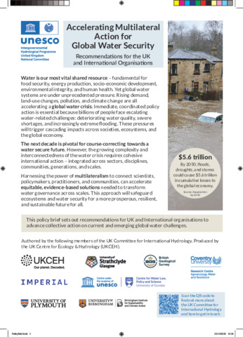 UK Committee for International Hydrology. 2025 Accelerating multilateral action for global water security. Recommendations for the UK and international organisations. UK Centre for Ecology and Hydrology, 2pp.