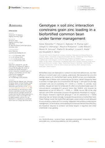 Matumba, Annie; Nalivata, Patson C.; Lark, R. Murray; Chimungu, Joseph G.; Monjerezi, Maurice; Wilson, Lolita; Limuwa, Moses M.; Broadley, Martin R.; Ander, Louise E.; Bailey, Elizabeth H.. 2025 Genotype × soil zinc interaction constrains grain zinc loading in a biofortified common bean under farmer management. Frontiers in Agronomy, 7, 1705304. 10.3389/fagro.2025.1705304
