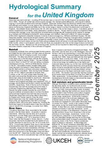 The monthly summary of hydrological conditions in the United Kingdom is compiled as part of the National Hydrological Monitoring Programme (a joint UKCEH and BGS enterprise). The report features contemporary data for rainfall, river flow, reservoir and groundwater levels in the form of maps and graphs. A commentary is provided on the status of the nation’s water resources and any notable hydrological events during the month. The National River Flow and National Groundwater Level Archives help provide an historical context for these contemporary assessments. Financial support for the production of the Hydrological Summaries is provided by Defra, the Environment Agency, the Scottish Environment Protection Agency, the Rivers Agency in Northern Ireland and the Office of Water Services.