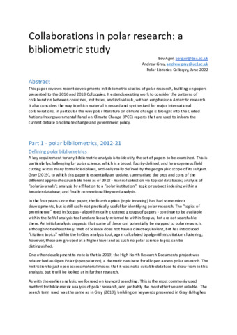 This paper reviews recent developments in bibliometric studies of polar research, building on papers presented to the 2016 and 2018 Colloquies. It extends existing work to consider the patterns of collaboration between countries, institutes, and individuals, with an emphasis on Antarctic research. It also considers the way in which material is reused and synthesised for major international collaborations, in particular the way polar literature on climate change is brought into the United Nations Intergovernmental Panel on Climate Change (IPCC) reports that are used to inform the current debate on climate change and government policy.