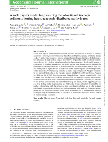 model conform better with the saturations from chloride concentration and (ii) clay contents calculated by our model fit the best with results from smear slide analysis. This study demonstrates that our double-solid-matrix model can be an effective tool to understand the effect of heterogeneously distributed hydrates on velocities, as well as obtain accurate hydrate content in marine isotropic sediments