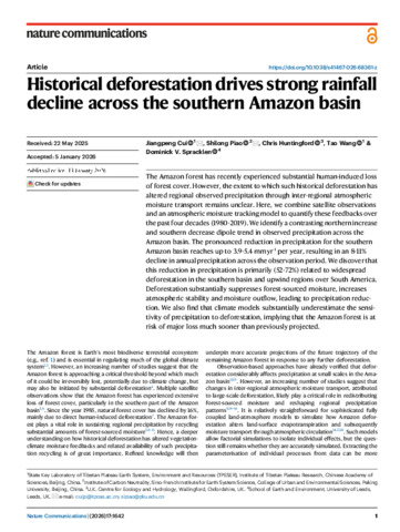 Historical deforestation drives strong rainfall decline across the southern Amazon basin.