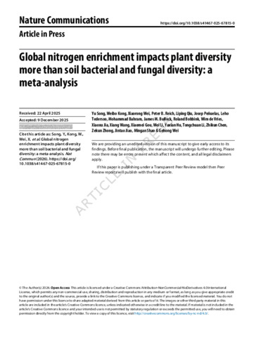 Global nitrogen enrichment impacts plant diversity more than soil bacterial and fungal diversity: a meta-analysis.