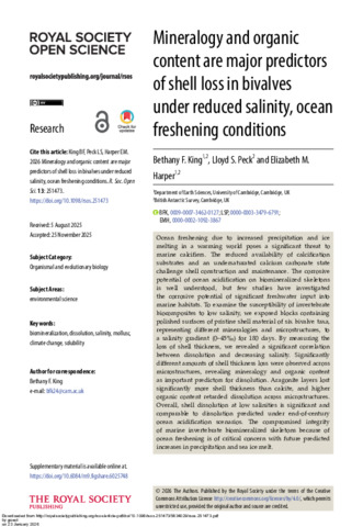 Mineralogy and organic content are major predictors of shell loss in bivalves under reduced salinity, ocean freshening conditions.