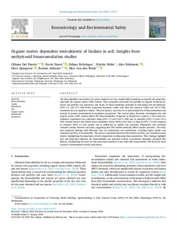 The bioavailability and toxicity of a given chemical can vary considerably depending on specific soil properties, especially the organic matter (OM) content. These properties determine the partition of organic chemicals between soil particles and porewater, and hence, its bioaccumulation potential in soft bodied soil invertebrates. LUFA 2.2 soil (3 % OM) better represents European arable soils than the standard OECD soil (10 % OM), commonly used in regulatory studies. This discrepancy, may lead to an underestimation of bioaccumulation and toxicity in natural environments in regulation assessments. The current study, therefore, investigates how soil organic matter (OM) content affects the bioaccumulation of lindane in Enchytraeus crypticus. A two-week toxicokinetic experiment was conducted using LUFA 2.2 soil (2.85 % OM) and an amended LUFA 2.2 soil (10 % OM). Results showed that kinetic bioaccumulation factors (BAFk) were twice as high in LUFA 2.2 soil compared to amended LUFA 2.2 soil, mainly due to differences in uptake rate constants. Elimination rate constants remained similar between soil types, suggesting that OM content primarily affects uptake processes. The study also compared findings with literature data on enchytraeids and earthworms, revealing higher uptake rate constants and BAFk in enchytraeids. The inverse correlation between OM content and BAFk was consistent across studies, highlighting the importance of soil composition in influencing bioaccumulation. These findings highlight how soil properties influence the bioavailability and potential toxicity of persistent, lipophilic chemicals like lindane, emphasizing the need for risk assessment practices to use soils with representative OM levels for more accurate environmental toxicity predictions.