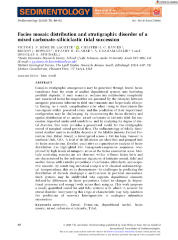 Complex stratigraphic arrangements may be generated through lateral facies transitions from the strata of aeolian depositional systems into bordering peritidal deposits. In such scenarios, sedimentary architectural complexity and associated facies heterogeneities are governed by the interplay between autogenic processes inherent to tidal environments and larger‐scale allocyclic forcing. As a result, complications arise when trying to discriminate the two signals within preserved strata, and the prediction of their depositional configuration may be challenging. By documenting the facies diversity and spatial distribution of an ancient mixed carbonate–siliciclastic tidal flat succession deposited under arid conditions, and by analysing its degree of stratal disorder, this work provides a generalised model for the stratigraphic record of marginal mixed peritidal flats. The sedimentology of tidally dominated shallow marine to sabkha deposits of the Middle Jurassic Carmel Formation (San Rafael Group) is investigated across a 350 km long transect in southern Utah, USA. A total of 26 lithofacies are identified and grouped into 11 facies associations. Detailed qualitative and quantitative analysis of facies distribution has highlighted two transgressive‐regressive sequences overprinted by high levels of autogenic noise at the facies association scale. Multiple coexisting associations are observed within different facies belts and are characterised by the sedimentary signatures of intricate coastal, tidal and aeolian forces with variable proportions of carbonate, siliciclastic and evaporitic material. By combining statistical analysis with classical sedimentological interpretations, this study demonstrates the challenges in predicting the distribution of discrete stratigraphic architectures in peritidal successions. Such systems may be subdivided into separate depositional elements defined by differences in facies proportions linked to changes in depositional processes and energy levels across their margins. This work proposes a newly quantified model for arid tidal systems with which to account for stratal disorder. Incorporating this singular characteristic may help constrain the predictions of reservoir heterogeneities in analogous subsurface successions.