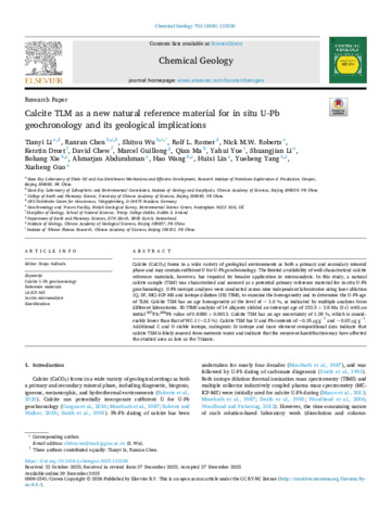 Li, Tianyi; Chen, Ranran; Wu, Shitou; Romer, Rolf L.; Roberts, Nick M.W.; Drost, Kerstin; Chew, David; Guillong, Marcel; Ma, Qian; Yue, Yahui; Li, Shuangjian; Xie, Bohang; Abdurahman, Ahmatjan; Wang, Hao; Lin, Huixi; Yang, Yueheng; Guo, Xusheng. 2026 Calcite TLM as a new natural reference material for in situ U-Pb geochronology and its geological implications. Chemical Geology, 703, 123230. 10.1016/j.chemgeo.2025.123230