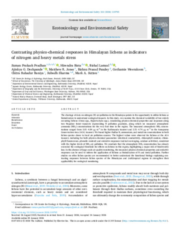 The shortage of data on nitrogen (N) air pollution in the Himalayas points to the opportunity to utilise lichens as bioindicators to understand ecological impacts. In this study, we examine the chemical variability of two widely occurring lichens (Usnea spp., Hypotrachyna spp.), considering physico-chemical properties and responses along two Nepalese forest transects representing N pollution gradients, along which we measured atmospheric ammonia (NH3) concentrations for the very first time in the region. The measured atmospheric NH3 concentrations ranged from 3.01–4.84 μg m–3 in the Kathmandu transect and 2.51–4.74 μg m–3 in the Annapurna Conservation Area (ACA) transect. We found higher thallus N, ammonium, and metal ion concentrations in both lichen species closer to local air pollution sources. The highest values were observed for lichens at the ACA transect, including for both physico-chemical parameters (electrical conductivity, chlorophyll content, chlorophyll fluorescence, phenolic content) and oxidative responses (radical scavenging, catalase activities), consistent with the higher levels of NH3 air pollution. We conclude that the atmospheric NH3 concentration has already exceeded the ecological threshold for effects on lichens in this region, highlighting a major risk of biodiversity loss. In the absence of large-scale air quality monitoring, the measured physico-chemical properties and oxidative responses can be used to inform the application of lichens as bioindicators of N and metal pollution. Further studies on other lichen species are recommended to better understand the functional biology explaining contrasting responses between lichen species of the Himalayan and (sub)tropical regions to strengthen their applicability for ecological monitoring.