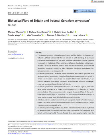 •1. This account presents information on all aspects of the biology of Geranium sylvaticum L. (Wood Crane's‐Bill) that are relevant to understanding its ecological characteristics and behaviour. The main topics are presented within the standard framework of the Biological Flora of Britain and Ireland : distribution, habitat, communities, responses to biotic factors, responses to environment, structure and physiology, phenology, floral and seed characters, herbivores and disease, history, conservation and management.