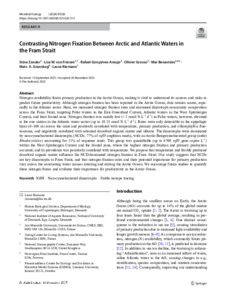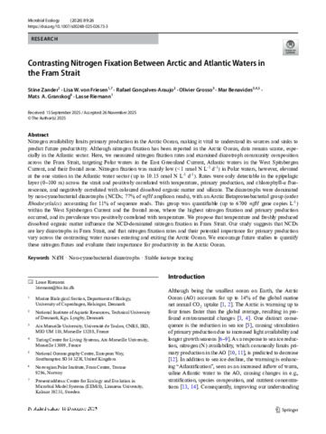 Zander, Stine; von Friesen, Lisa W.; Gonçalves-Araujo, Rafael; Grosso, Olivier; Benavides, Mar; Granskog, Mats A.; Riemann, Lasse. 2026 Contrasting nitrogen fixation between Arctic and Atlantic waters in the Fram Strait. Microbial Ecology, 89 (1). 10.1007/s00248-025-02673-3