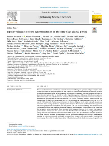 Precise synchronization of paleoclimate records is essential for inferring the dynamics and past evolution of the climate system. For the last glacial period, the time scales of ice cores from the Greenland and Antarctic ice sheets have been synchronized by the use of cosmogenic radionuclides, atmospheric gas concentrations, and traces of large volcanic eruptions. Here we identify the sulfate deposition signatures of the same 300 volcanic eruptions in different Greenland and Antarctic ice cores to obtain an inter-hemispheric volcanic ice-core synchronization of the entire last glacial period and the early Holocene (10–110 ka). Compared to earlier bipolar volcanic synchronizations, we close a gap in the period 16.5–24.5 ka and extend the synchronization to cover the 10–12 ka and 60–110 ka intervals. Furthermore, we increase the density of bipolar match points and make updates and corrections of the existing bipolar and unipolar synchronizations. The volcanic synchronization is in agreement with existing bipolar synchronizations from independent 10Be and methane matching. The bipolar volcanic synchronization allows us to determine the precise phasing of interhemispheric abrupt climate events throughout the last glacial period, particularly those associated with Dansgaard-Oeschger (D-O) events. Our improved synchronization and extended time period allow us to show that at the time of the D-O warming transitions, the average Antarctic temperature reaches a maximum within decades after the Greenland temperature maximum. This rapid Antarctic warming is superimposed on the well-known millennial-scale thermal bipolar-seesaw warming in Antarctica commonly attributed to oceanic heat transport and confirms earlier work that the abrupt change observed in Greenland is associated with a direct atmospheric circulation change at a global scale. The exception to this pattern occurs for the EDML ice-coring site located in the Atlantic sector of Antarctica, potentially related to sea-ice conditions in the Weddell Sea. Comparison to state-of-the-art climate model simulations shows excellent agreement in the overall bipolar climate phasing at the warming transitions and allows for analysis of the climate-system behavior at those transitions. The model simulations suggest that the abrupt Antarctic warming response observed is connected with an interhemispheric atmospheric response involving a global scale reorganization of the zonal mean atmospheric circulation. The abrupt D-O surface warming signal in the Northern Hemisphere is teleconnected into an abrupt Antarctic surface warming through changes in the Southern Hemisphere eddy-driven jet and anomalous circulation changes in the associated Ferrel and Polar cells.