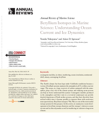 Yokoyama, Yusuke; Sproson, Adam D.. 2026 Beryllium isotopes in marine science: Understanding ocean current and ice dynamics. Annual Review of Marine Science, 18 (1). 121-139. 10.1146/annurev-marine-040224-033226