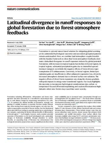 Latitudinal divergence in runoff responses to global forestation due to forest-atmosphere feedbacks.
