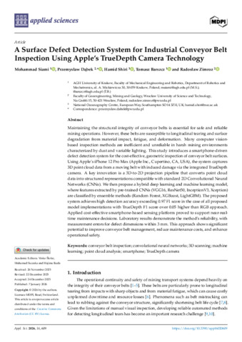 Maintaining the structural integrity of conveyor belts is essential for safe and reliable mining operations. However, these belts are susceptible to longitudinal tearing and surface degradation from material impact, fatigue, and deformation. Many computer vision-based inspection methods are inefficient and unreliable in harsh mining environments characterized by dust and variable lighting. This study introduces a smartphone-driven defect detection system for the cost-effective, geometric inspection of conveyor belt surfaces. Using Apple’s iPhone 12 Pro Max (Apple Inc., Cupertino, CA, USA), the system captures 3D point cloud data from a moving belt with induced damage via the integrated TrueDepth camera. A key innovation is a 3D-to-2D projection pipeline that converts point cloud data into structured representations compatible with standard 2D Convolutional Neural Networks (CNNs). We then propose a hybrid deep learning and machine learning model, where features extracted by pre-trained CNNs (VGG16, ResNet50, InceptionV3, Xception) are classified by ensemble methods (Random Forest, XGBoost, LightGBM). The proposed system achieves high detection accuracy exceeding 0.97 F1 score in the case of all proposed model implementations with TrueDepth F1 score over 0.05 higher than RGB approach. Applied cost-effective smartphone-based sensing platform proved to support near-real-time maintenance decisions. Laboratory results demonstrate the method’s reliability, with measurement errors for defect dimensions within 3 mm. This approach shows significant potential to improve conveyor belt management, reduce maintenance costs, and enhance operational safety.