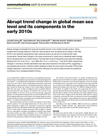 Abrupt changes at decadal time scale are recurrent events in the modern climate system. Using multiple trend-change detection methods, here we report such an abrupt trend change in the early 2010s in the altimetry-based global mean sea level record, as well as in its thermal and mass components. Abrupt trend change in the mass component is mostly due to terrestrial water storage and to a lesser extent to ice sheet melting. The linear rate of rise of the global mean sea level increases abruptly from 2.9 ± 0.22 mm yr−1 over 1993–2011 to 4.1 ± 0.25 mm yr−1 over 2012–2024. Abrupt trend changes in numerous climate parameters have also been reported in the early 2010s, suggesting a more global phenomenon. Internal climate variability is likely the main driver of the early 2010s sharp change observed in sea level and components, although one cannot totally exclude any additional contribution from increased radiative forcing.