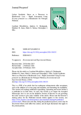 Lichen symbiotic stress as a precursor to biodiversity loss – rapid assessment using Evernia prunastri as a bioindicator for nitrogen pollution.